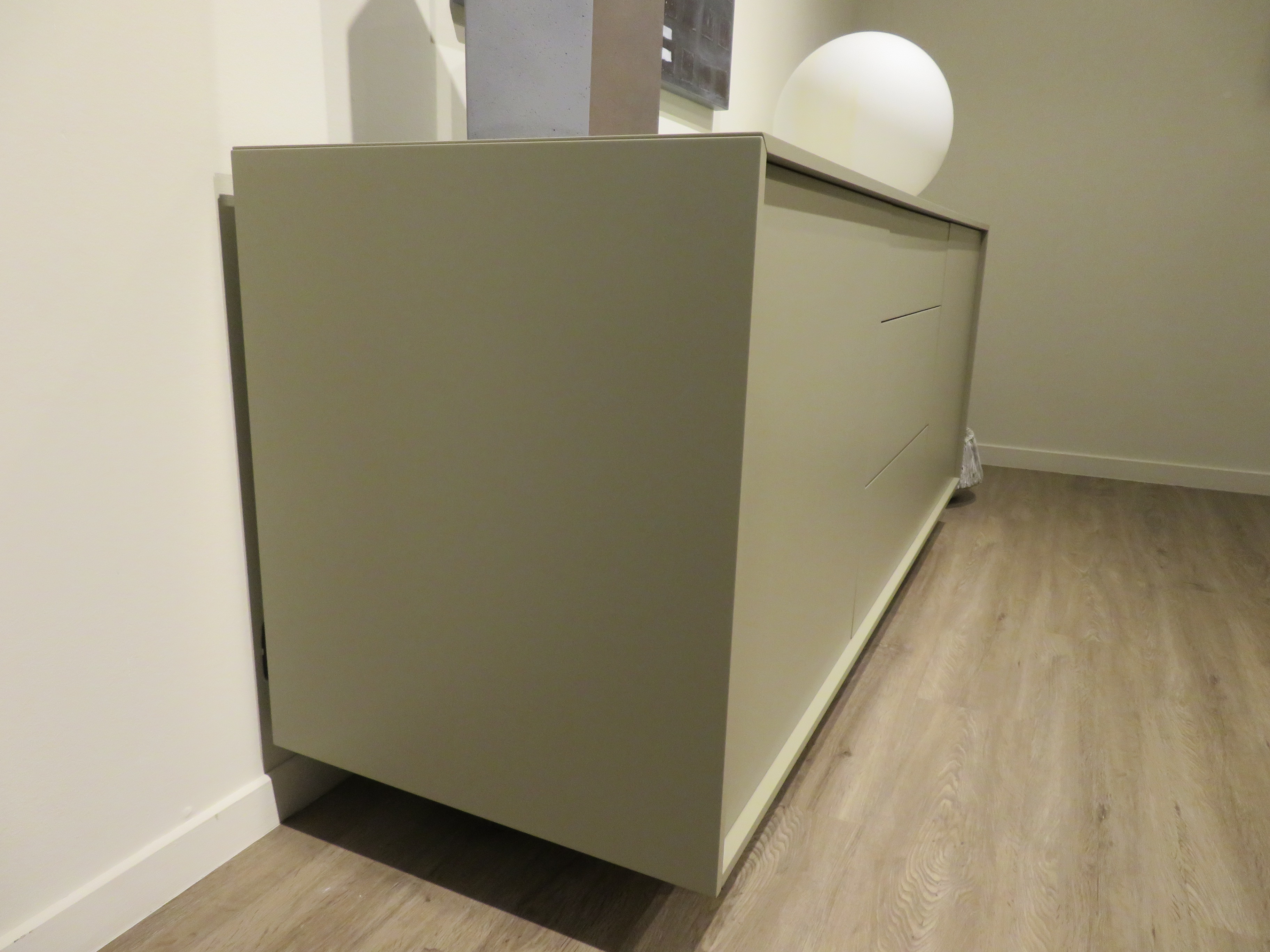 Madia da soggiorno Sangiacomo in legno laccato opaco colore juta, su basamento con piedi in metallo titanio h. 12 cm. con 2 ante e 3 cassetti che offrono ampie e funzionali capacità di contenimento.