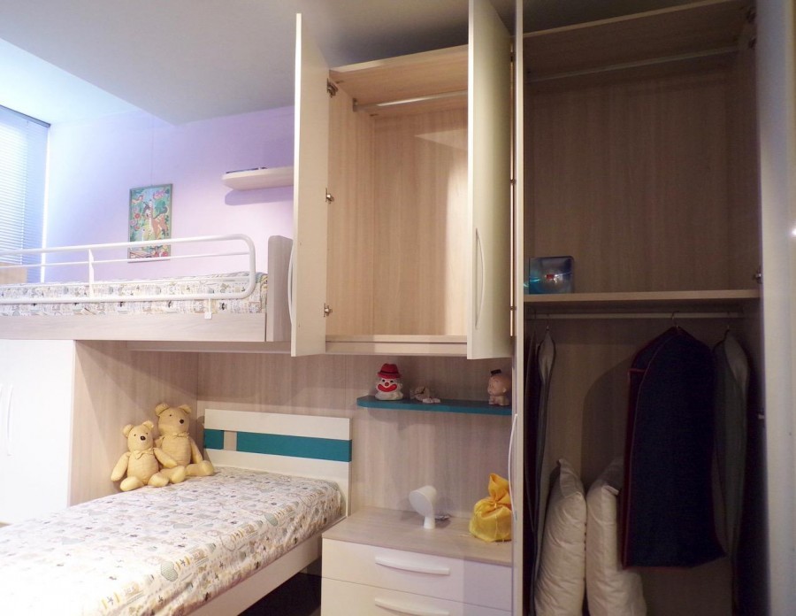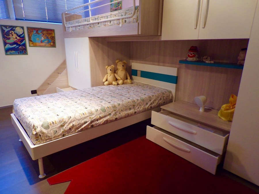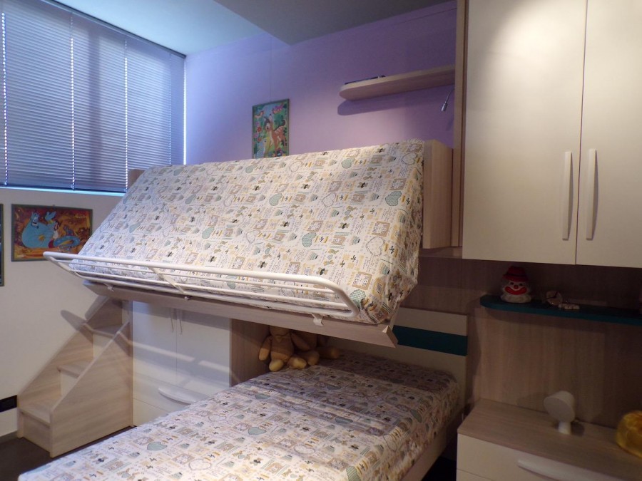 La cameretta è composta da: armadio a ponte in laminato,  armadio a 2 ante con 2 cassetti a sinistra del letto, profondo 90 con tubo per appendere gli abiti e ripiani sul retro, letto ribaltabile e letto sotto ponte con rete a doghe, scaletta laterale.