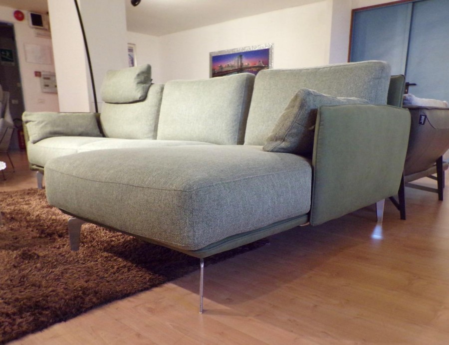 Abbiamo deciso di vendere a prezzo d’occasione questo divano con penisola in tessuto verde, per rinnovo esposizione di Zogno, Bergamo.