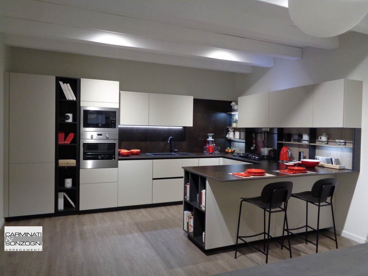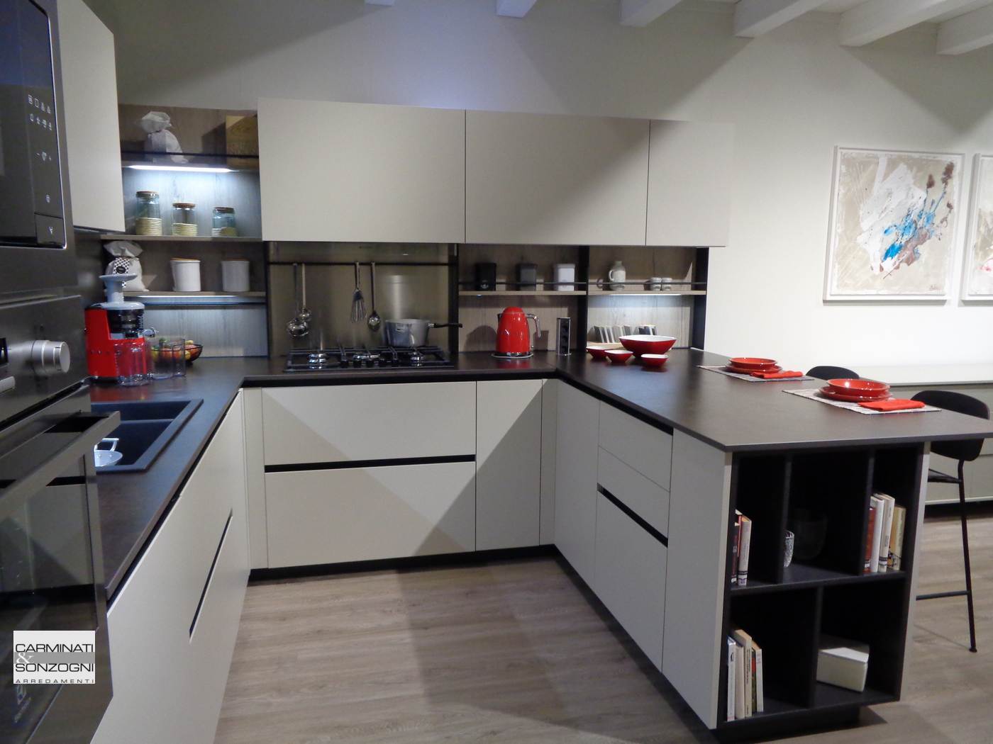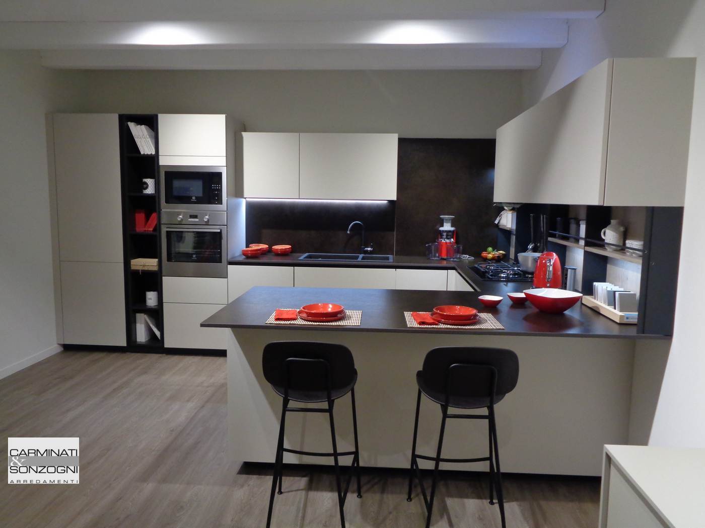 Cucina modello Trend La Casa Moderna in esposizione con piano e schienali in ceramica Caranto, la colonna a giorno tra il frigo e la colonna forno alleggerisce la composizione creando spazio per soprammobili e piccoli utensili.