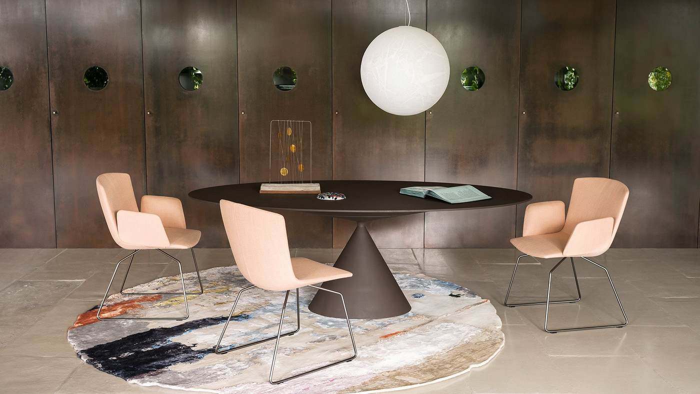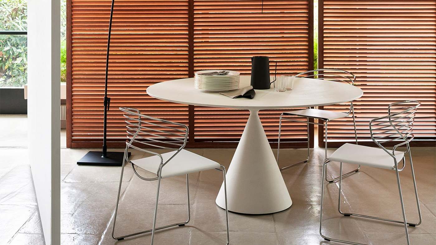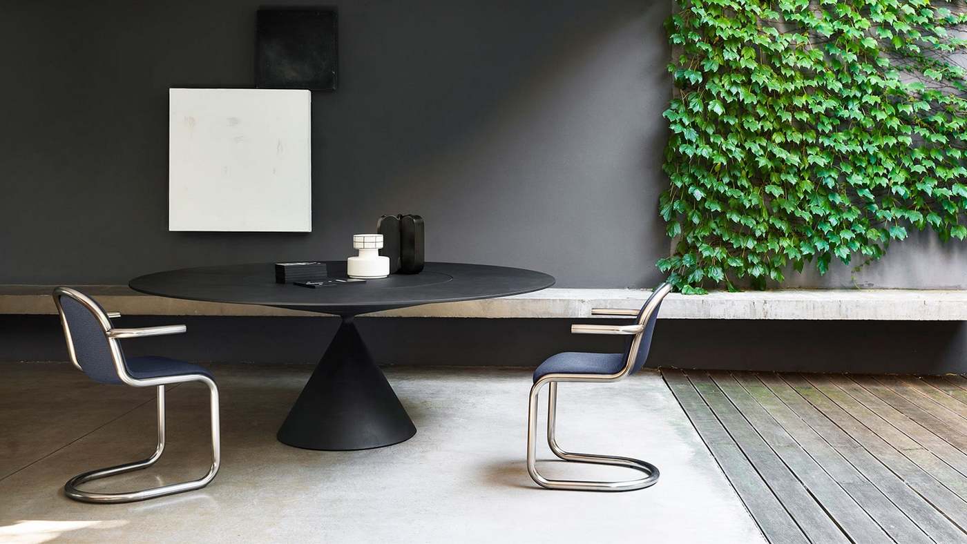 Il tavolo Clay della Desalto è formato dalla sovrapposizione di due coni di forma diversa. La forma particolare che sembra sfidare la gravità mantiene un equilibrio perfetto e crea oggetto di design originale.