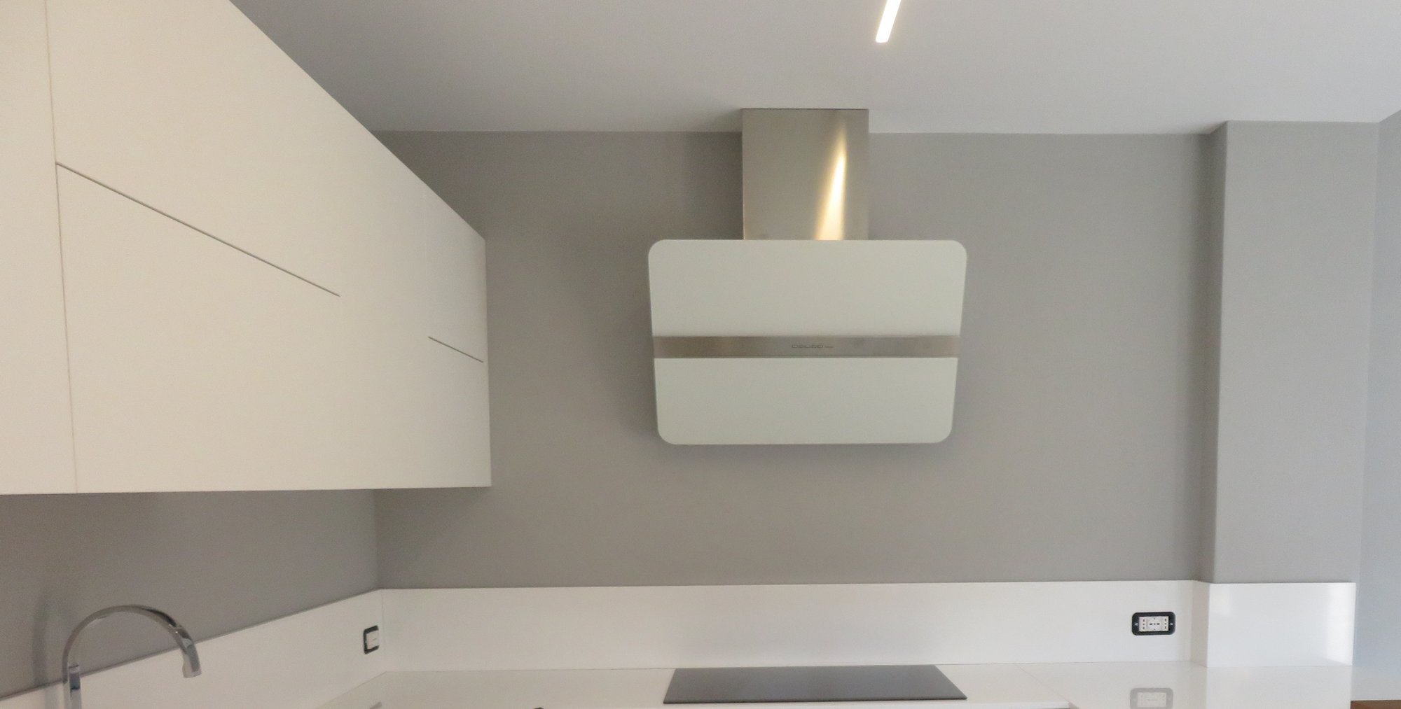 cappa Flipper Falmec in vetro bianco, piani e schienali in quarzo