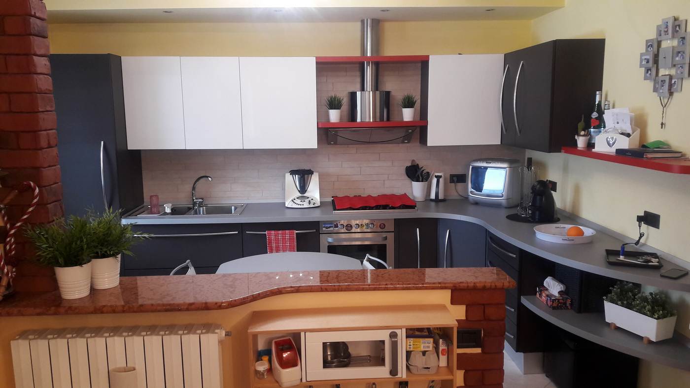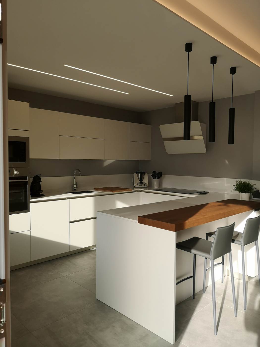 Eliminando la bussola d’ingresso, inutilizzata, ed il muro che separava cucina e soggiorno, l’ambiente assume tutto un altro impatto, sfruttando al massimo lo spazio. La cucina , grazie agli arredi di “La Casa Moderna” in nobilitato seta ed impreziosita da piani e alzate in quarzo, prende un’altra forma ; la penisola con snack in legno inoltre crea una sorta di divisorio dalla la zona living, senza compromettere l’ampiezza degli ambienti