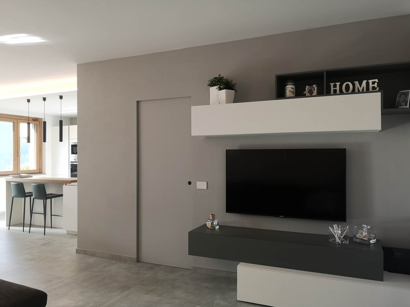 mobile da soggiorno sulla nuova parete con porta scorrevole a filo muro.