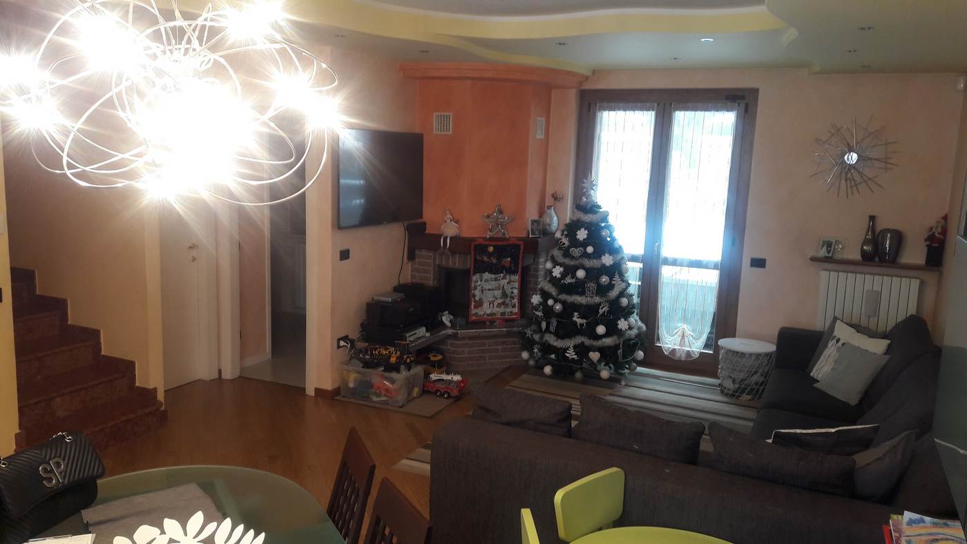 Uno scorcio della zona soggiorno, dove il vecchio camino e la scala a vista vengono sostituiti da una più fresca e moderna parete, risolvendo, oltre ai difetti estetici, i ben piu’ importanti problemi legati agli sbalzi di temperatura causati dai diversi piani che compongono la casa; In questo modo viene dato ampio respiro alla zona tv che con il suo mobile moderno e raffinato, acquisisce un’estetica piu’ fine ed elegante.