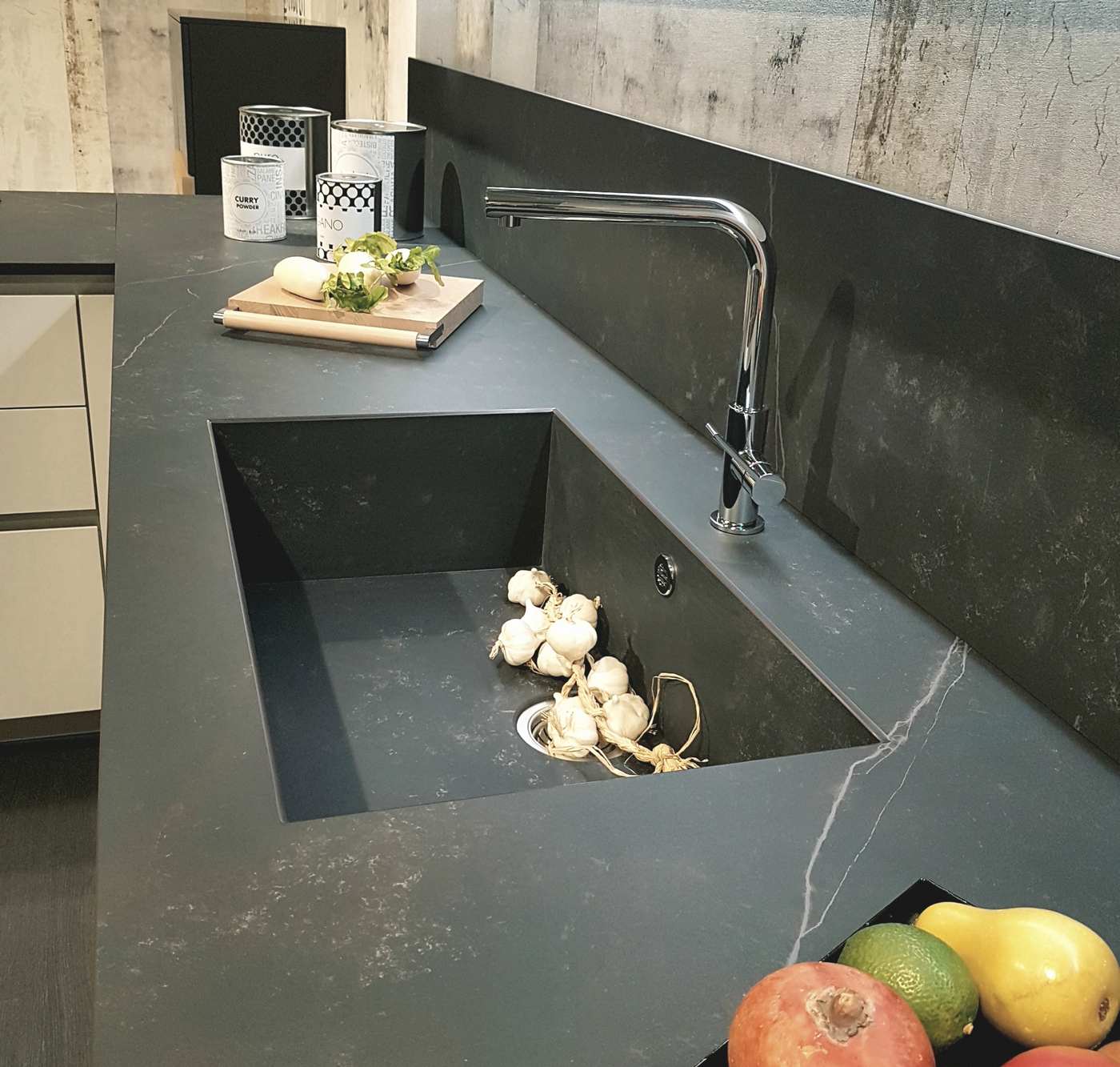 particolare vasca lavello integrato in Dekton sulla cucina in esposizione